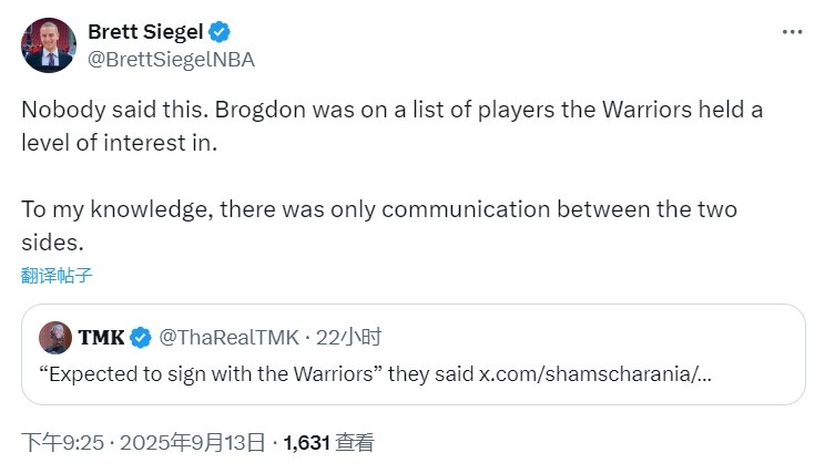 Brett Siegel转发了该网友的这条动态,并在旁边写道:“没人说过这个话。布罗格登曾是勇士有一定兴趣的球员之一。