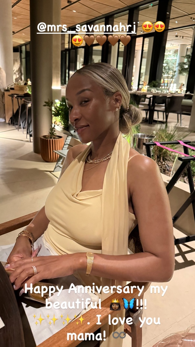 詹姆斯晒出妻子的一张照片,并写道:“@萨凡纳 😍😍😍🤎🤎🤎🤎结婚纪念日快乐,我美丽的👸🏾🦋!✨✨✨我爱你,孩他妈!♾️”