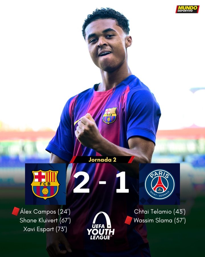 青年欧冠巴萨2-1逆转巴黎,克鲁伊维特小儿子兜射死角破门