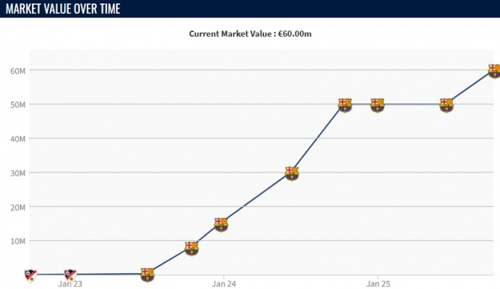 费尔明目前已经代表巴萨一线队出场93次,贡献21球11助,球员德转身价也由两年前的800万欧元上涨至如今的6000万欧元