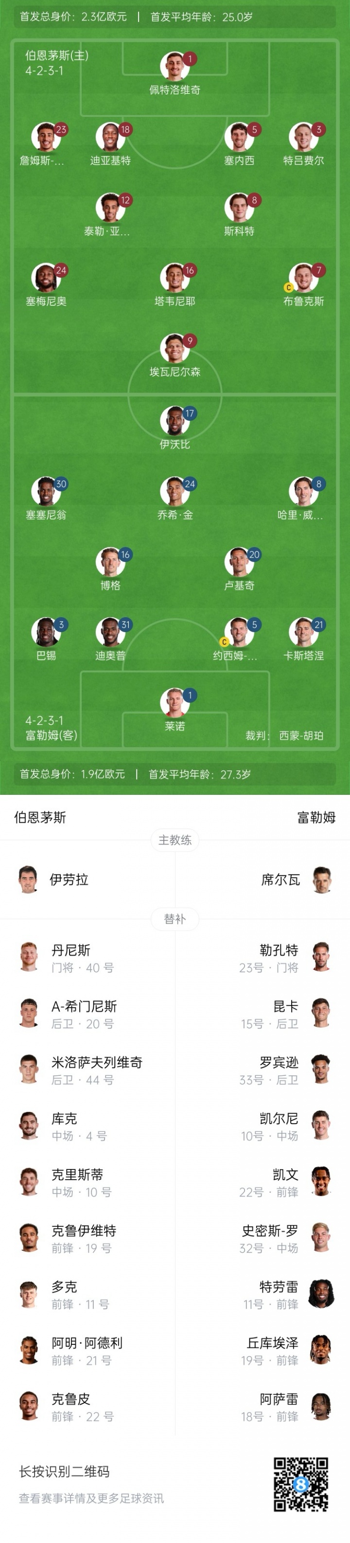 富勒姆首发:1-莱诺、31-迪奥普、5-安德森、3-巴锡、21-卡斯塔涅、16-博格、20-卢基奇、30-塞塞尼翁、24-乔希-金、17-伊沃比、8-哈里-威尔逊