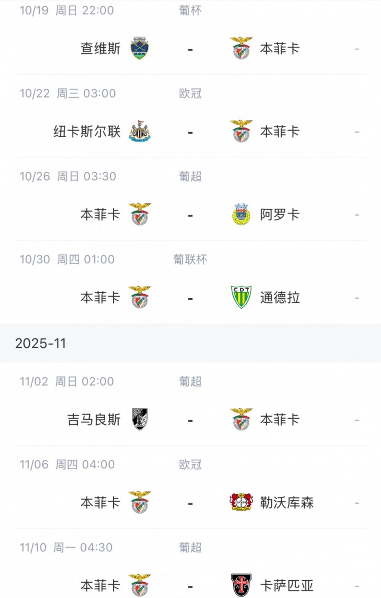 10月30日,本菲卡将在葡联杯1/4决赛对阵通德拉,11月2日葡超客战吉马良斯,6日欧冠主场对阵勒沃库森,10日葡超主场对阵卡萨匹亚。