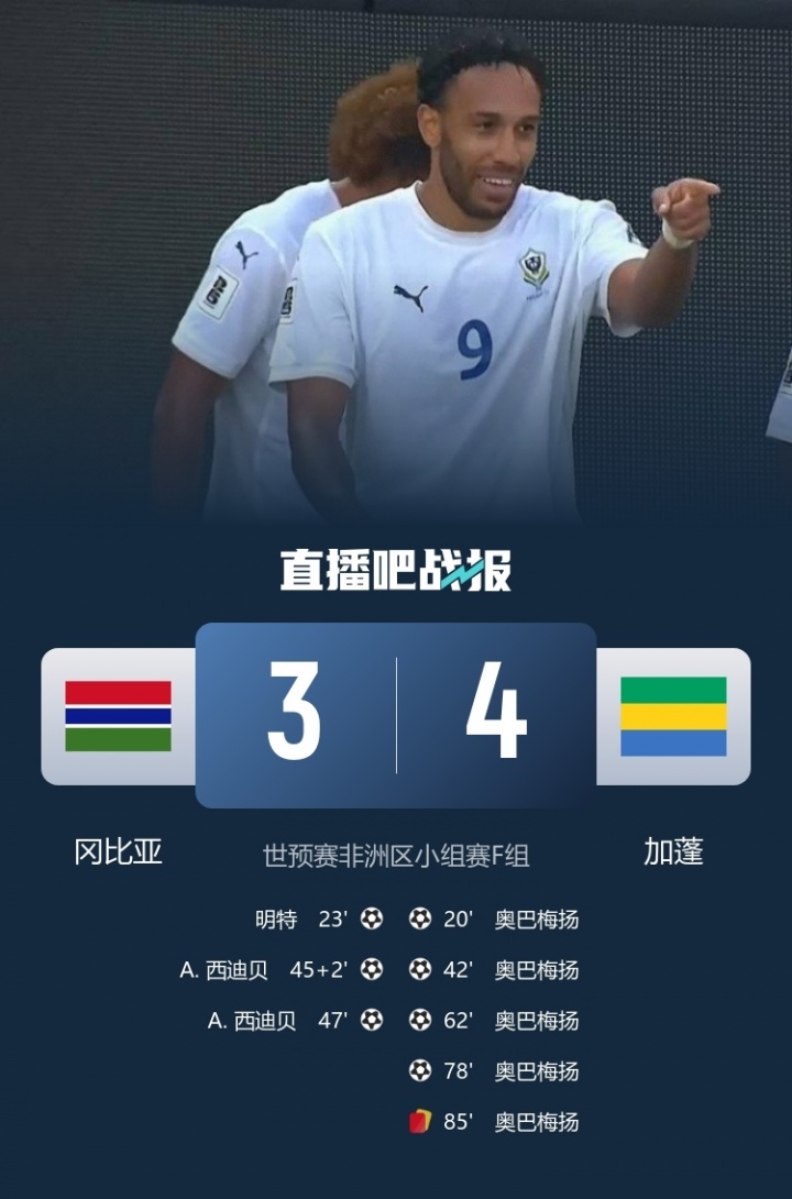10月10日讯 世预赛非洲区F组第9轮比赛,加蓬客场4-3战胜冈比亚,36岁的加蓬前锋奥巴梅扬上演大四喜,一己之力为加蓬拿下了这场胜利!