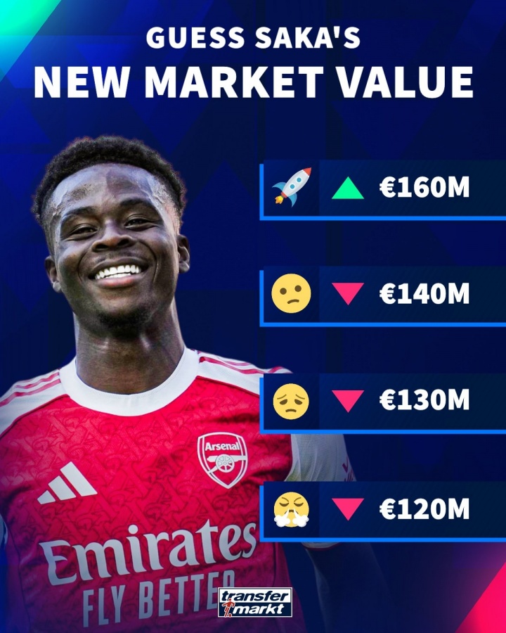 涨还是跌?德转预热萨卡身价变动:最低1.2亿欧🧊最高1.6亿🔥...