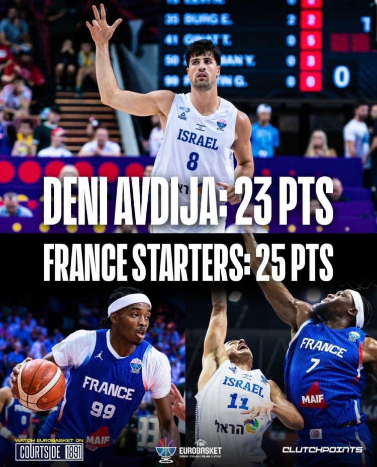 此役,以色列男篮前锋阿夫迪亚10投7中,得到23分8篮板2助攻2抢断;作为对比,法国男篮本场的首发五人合计只得到了25分。