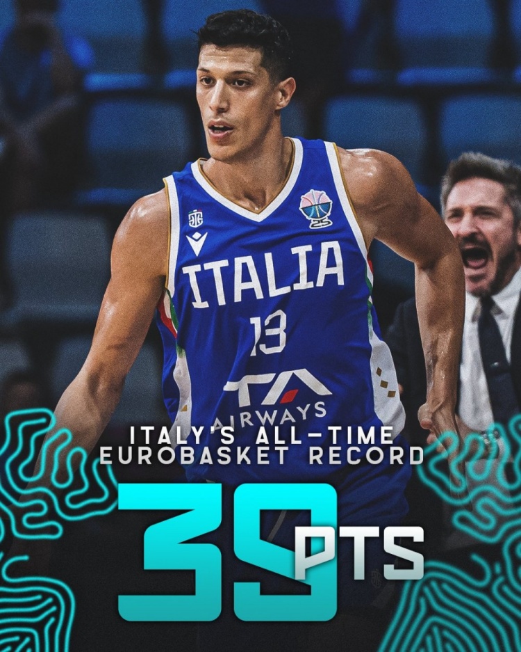 他也打破了意大利球员欧锦赛单场得分纪录,此前这一纪录是巴尼亚尼2011年的36分。