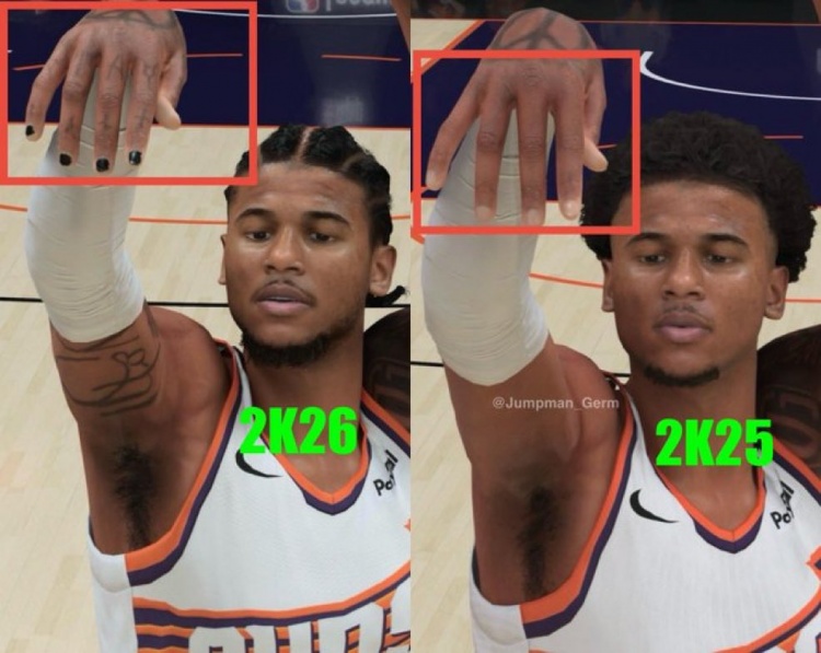有网友细心发现指出,在2K26的游戏画面中,2K给杰伦-格林细心地在其指甲盖上涂了指甲油;而在2K25中,杰伦-格林是没有指甲油的。