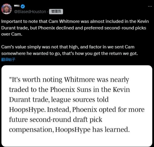 据美媒Hoopshype报道,消息人士透露,需要特别指出的是白魔此前差点被纳入杜兰特的交易当中,可太阳队拒绝了这样的提议,他们更愿意多拿几个次轮选秀权而非选择惠特莫尔。