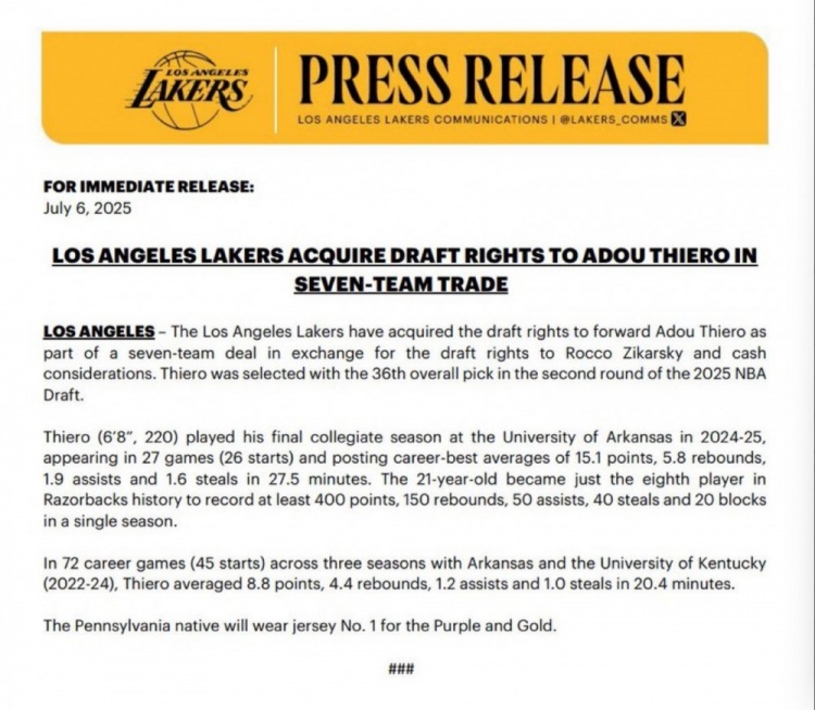 湖人官方后续宣布,球队正式通过交易得到今年的36号秀阿杜-蒂耶罗。