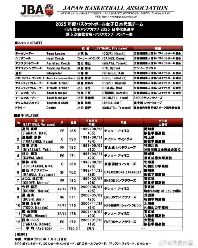 日本女篮今天中午公布了出征女篮亚洲杯的12人大名单。这支队伍平均年龄26.9岁,平均身高1米8,将会是中国女篮卫冕路上的最大障碍。