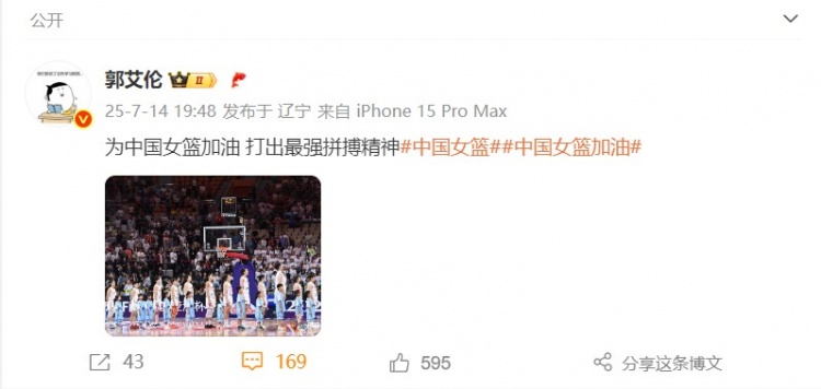 7月14日讯 今天,郭艾伦在社媒上为中国女篮加油助威。
