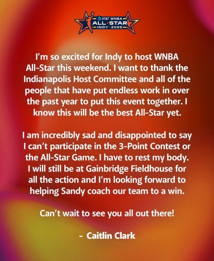 克拉克写道:“对于印第安纳波利斯能够举办本周的WNBA全明星赛,我感到非常兴奋。我想要感谢印第安纳波利斯的举办委员会以及过去一年里为举办这次活动而付出无数努力的所有人。我知道这次比将会是最精彩的全明星赛。