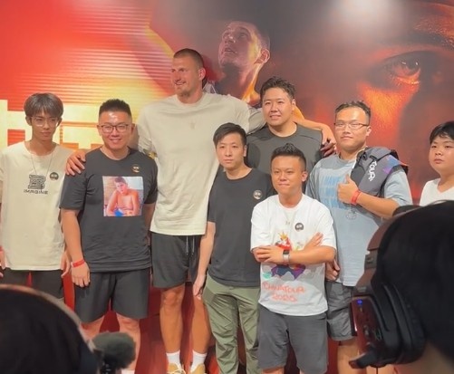 7月18日讯 约基奇中国行深圳站,在合影环节一位球迷穿着印有约基奇儿童照的T恤,成功逗笑了约老师。