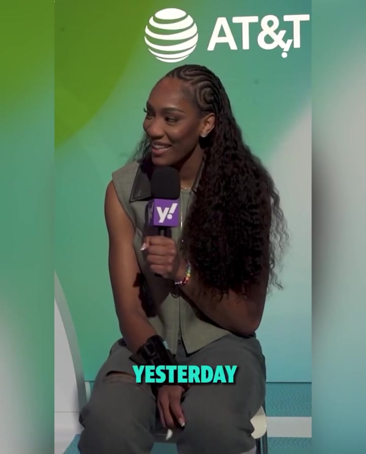 记者在采访中问她和特殊嘉宾一起穿着红衣服入场一事,阿贾开始打马虎:“说实话,我只是刚好看到了他,然后一起进了场。我们看着彼此的打扮,哇哦,不约而同哦。看到NBA球员来现场支持感觉很棒。”