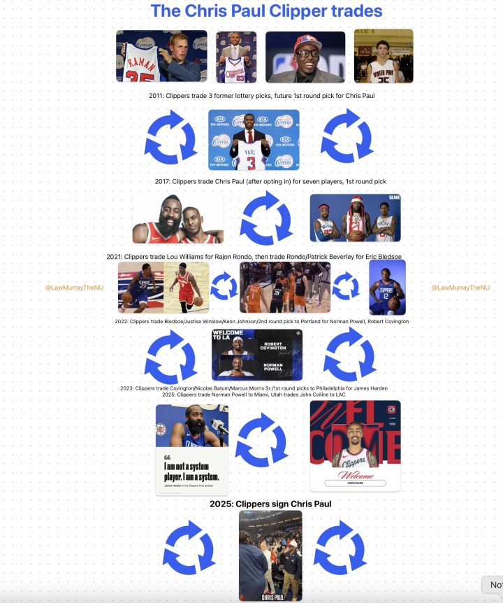07月23日讯 快船队记Law Murray晒出了一张图,展现了保罗是如何来到快船、离开快船、又回到快船的。