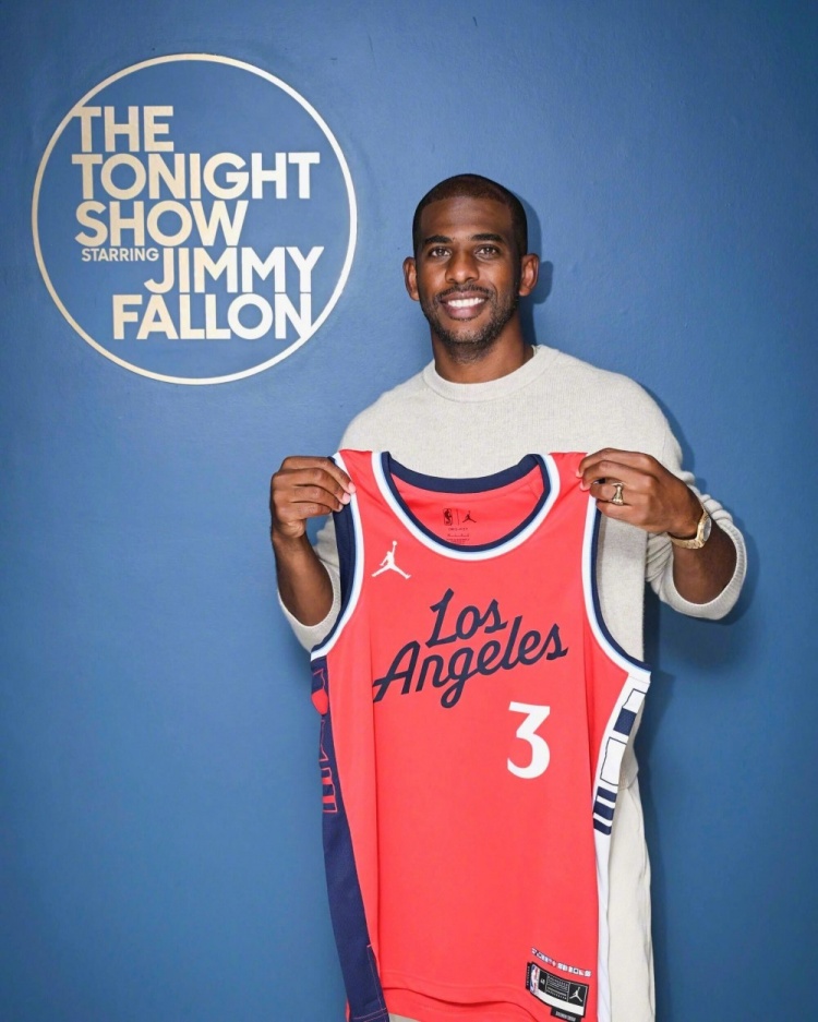 日前,保罗带着3号快船球衣亮相《吉米今夜秀》(The Tonight Show),并与主持人一同合影。