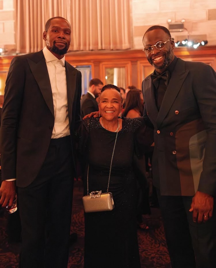 哥俩好😄杜兰特追梦一同参加美女记者婚礼 俩人微笑合影