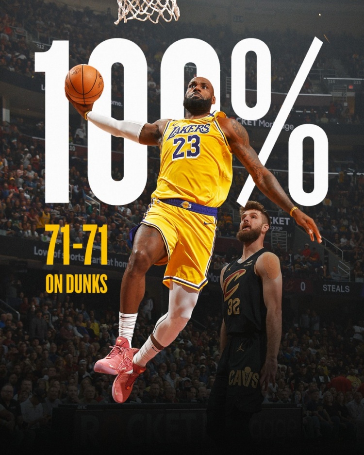 💪🏾詹姆斯上赛季71次扣篮全中 联盟50次以上尝试中唯一一人