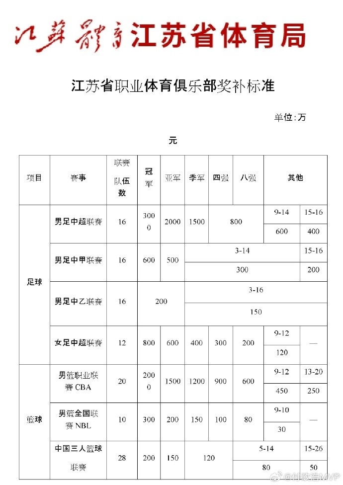 江苏喊本省的职业体育俱乐部领奖补了!近日,江苏省体育局发文安排省内各职业体育部申报江苏省体育事业发展专项资金(职业体育俱乐部发展)奖补资金,主要按照上一年成绩来奖励。比如,江苏省对夺得中超冠军的俱乐部奖励3000万,但遗憾的是,江苏目前没有中超俱乐部;对CBA冠军队奖励2000万,江苏目前有两家CBA俱乐部,南京同曦上赛季是第12名,江苏肯帝亚男蓝是第20名,按照江苏省体育局的讲不标准,同曦能从省体育局层面申领到450万,肯帝亚能申领到250万元。