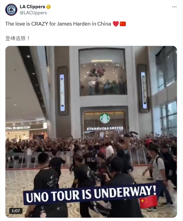 快船官推晒出哈登中国行的视频,画面中人潮涌动,快船官推还写道: