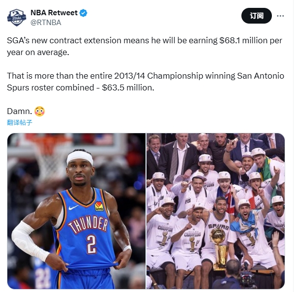 08月07日讯 近日,美媒NBA Retweet对比了雷霆球星亚历山大新合同平均年薪和14冠军马刺全队队员总薪资。