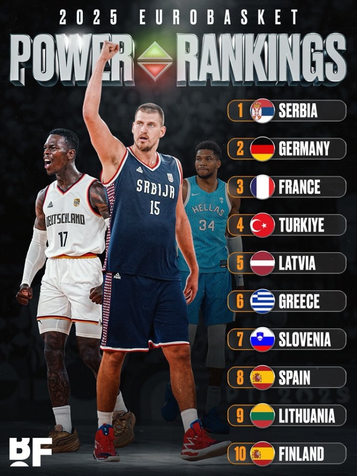 群雄争霸!欧锦赛各国排名:塞尔维亚居首 德国2 法国3 西班牙8!