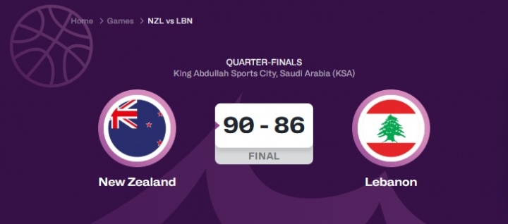 08月15日讯 今日2025年男篮亚洲杯1/4决赛,新西兰男篮开局不利,在比赛中最多时落后22分,但他们最终完成了逆转,以90-86淘汰上届亚军黎巴嫩,杀进四强将对阵中国男篮。