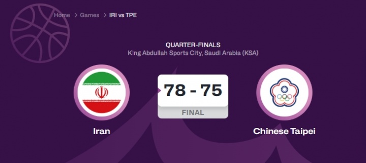 而1/4决赛(8月14日),中国台北男篮一度手握21分的领先优势,但是最终被伊朗男篮逆转,无缘半决赛。伊朗男篮则将在半决赛中对垒卫冕冠军澳大利亚男篮。
