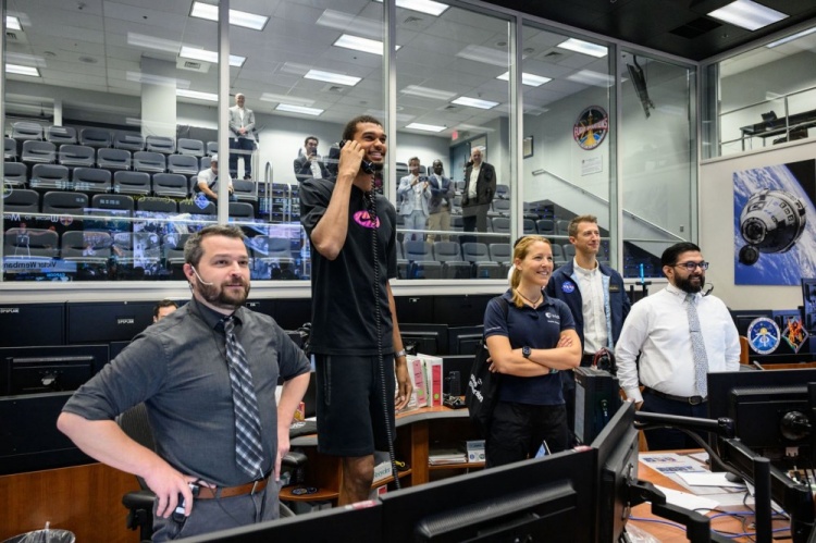 8月31日讯 美国宇航局约翰逊航天中心官方社媒账号晒出了文班亚马参观的照片,并配文写到:“从球场到宇宙,文班亚马无处不闪光 🏀🚀。”