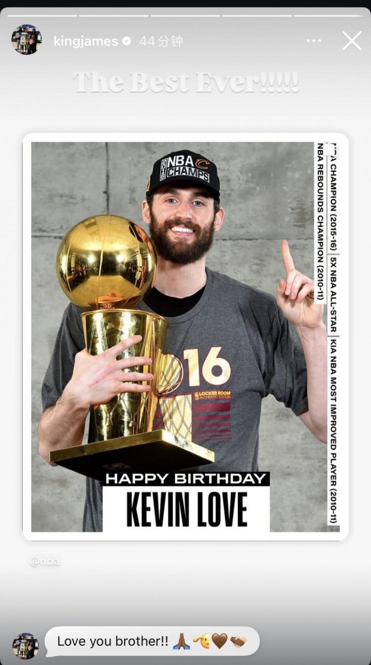 詹姆斯转发NBA官方发布的为凯文-乐福庆生贴,并写道:“史上最好的!爱你,兄弟!🙏🏾🫡🤎🫱🏾🫲🏻”
