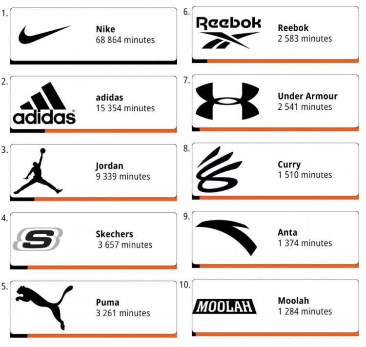 9月12日讯 本赛季WNBA常规赛已全部结束,球鞋媒体Kixstats统计了本赛季单一款式球鞋上脚时间的TOP10排行,还有品牌上脚时间排行TOP10。
