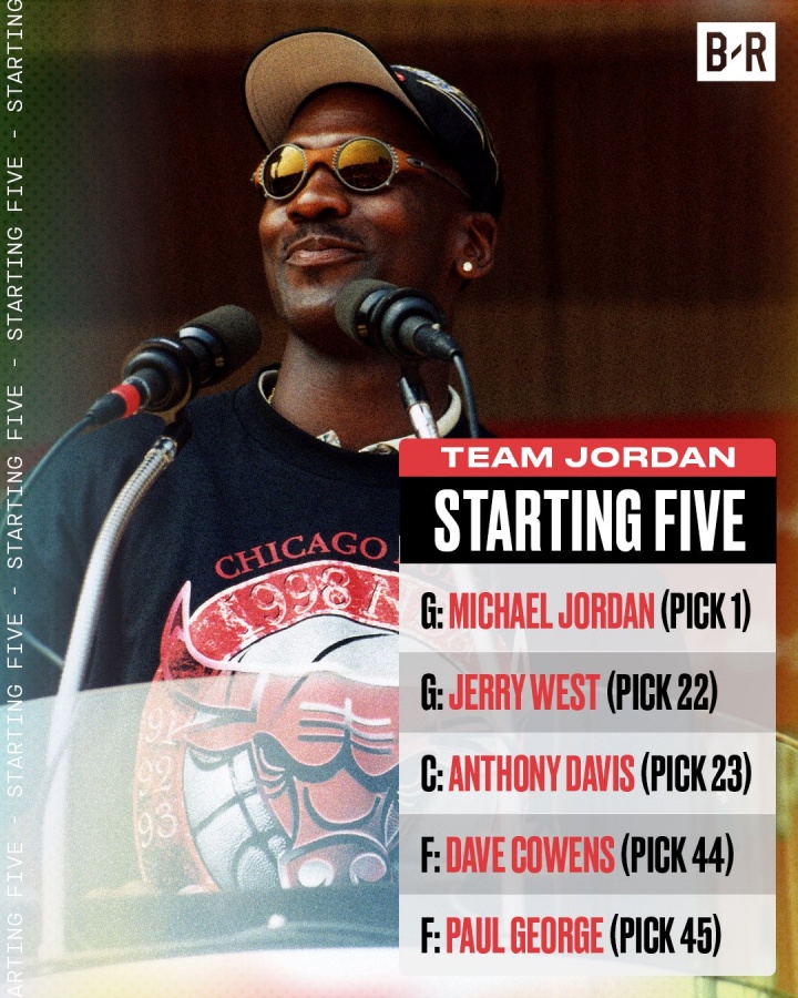 迈克尔-乔丹(1顺位)、杰里-韦斯特(22顺位)、安东尼-戴维斯(23顺位)、达夫-考恩斯(44顺位)、保罗-乔治(45顺位)
