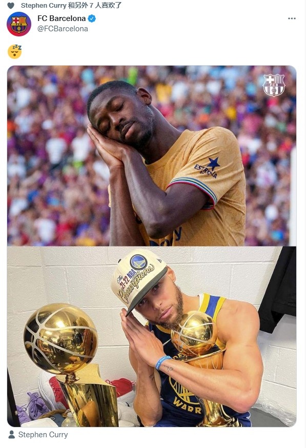 早在2022年7月底,当时还在巴萨的登贝莱就模仿着做过这个庆祝动作,库里当时点赞并表示:“晚安是新的潮流!”