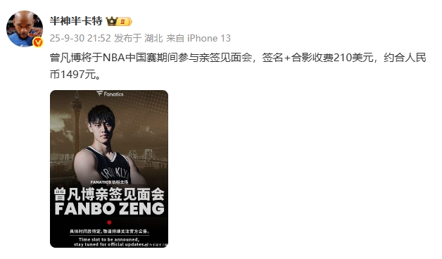 媒体人:曾凡博中国赛期间将参与亲签见面会 签名+合影收费1497元