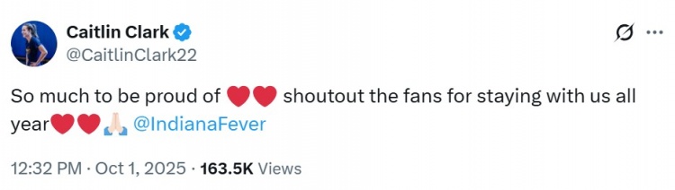 赛后,因伤赛季报销的狂热球星凯特琳-克拉克更推鼓励球队,她写道:“满满的骄傲 ❤️❤️ 感谢球迷们一年来的陪伴与支持 ❤️❤️🙏🏻 @印第安纳狂热!”
