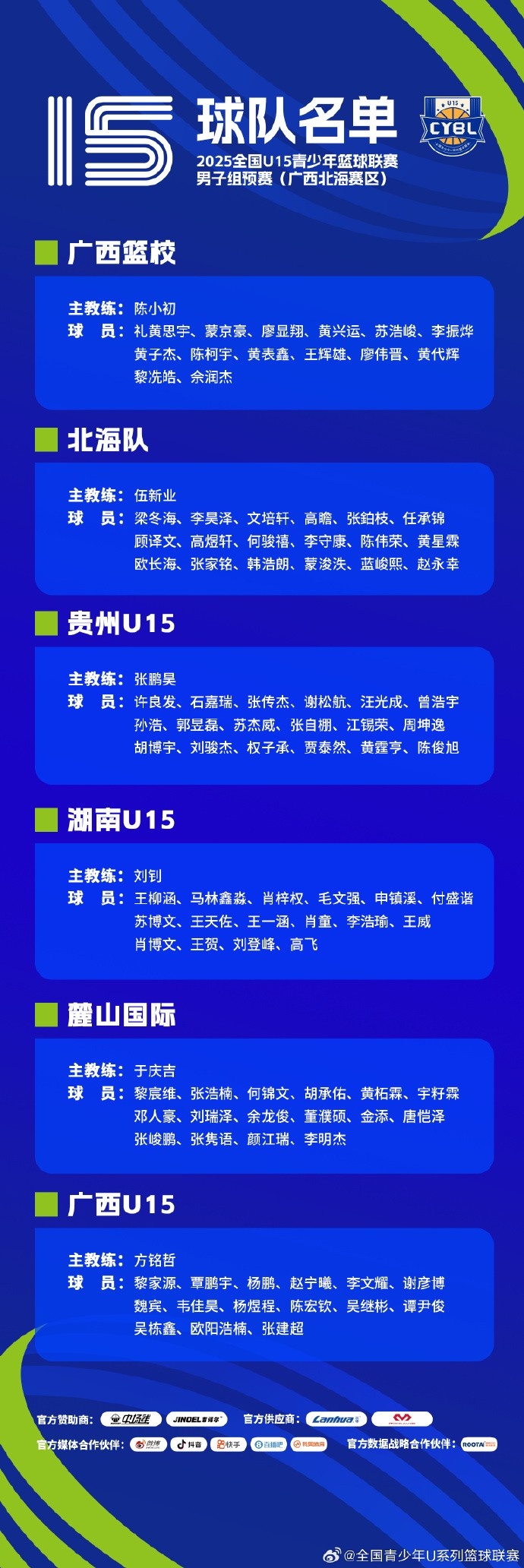 2025年全国U15青少年篮球联赛男子组预赛将于10月7日至13日举行,设广西北海、吉林长春、江西南昌、宁夏石嘴山4个赛区,现公布各赛区参赛球员名单。