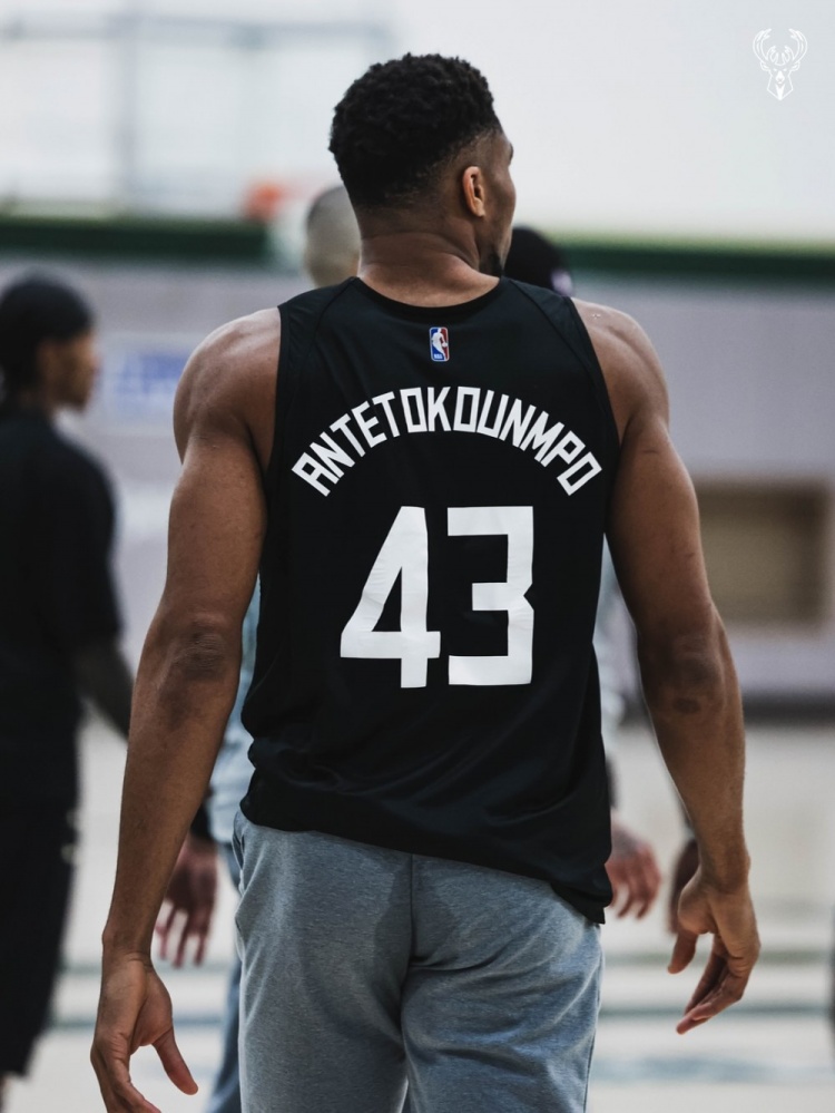 可以看到字母哥穿着字母哥哥(萨纳西斯)的43号球衣进行训练,双臂的肌肉轮廓让人惊叹,力量感简直拉满!