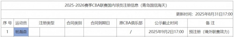 8月31日讯 CBA官网今天更新了国内球员注册信息,其中,青岛男篮为杨瀚森进行了预注册。