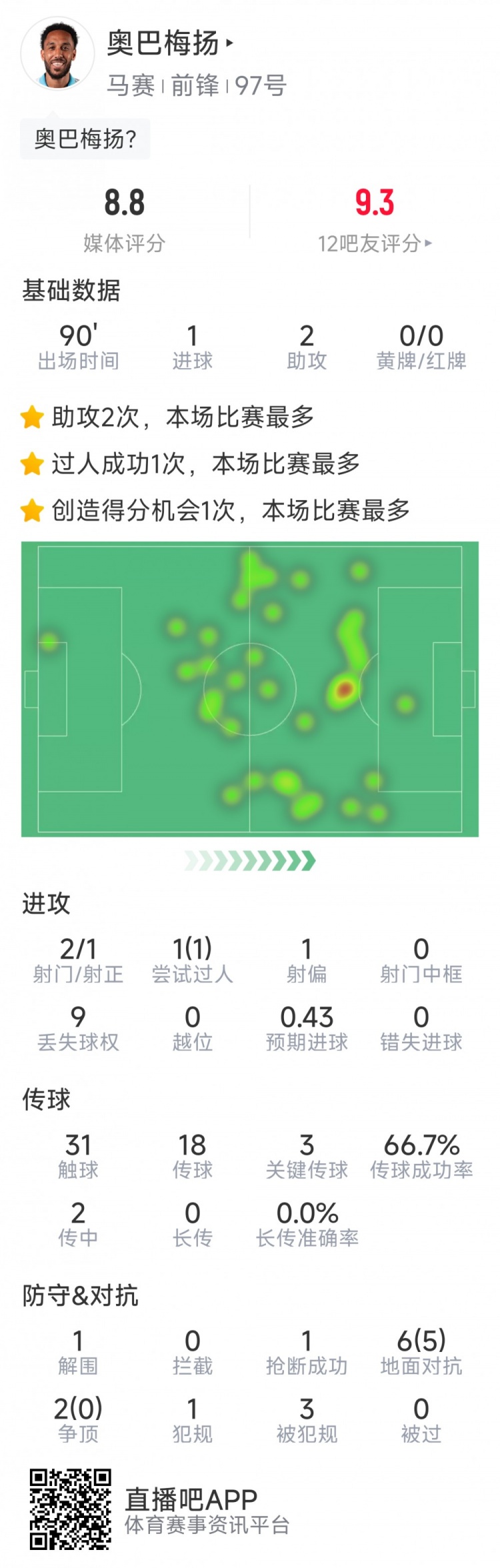 焕发第二春,奥巴梅扬本场数据:1粒进球,2次助攻,3次关键传球