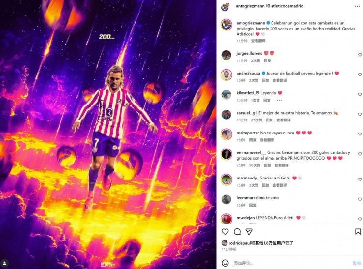 格列兹曼社媒纪念马竞生涯200球:身披这身球衣庆祝是一种荣幸...
