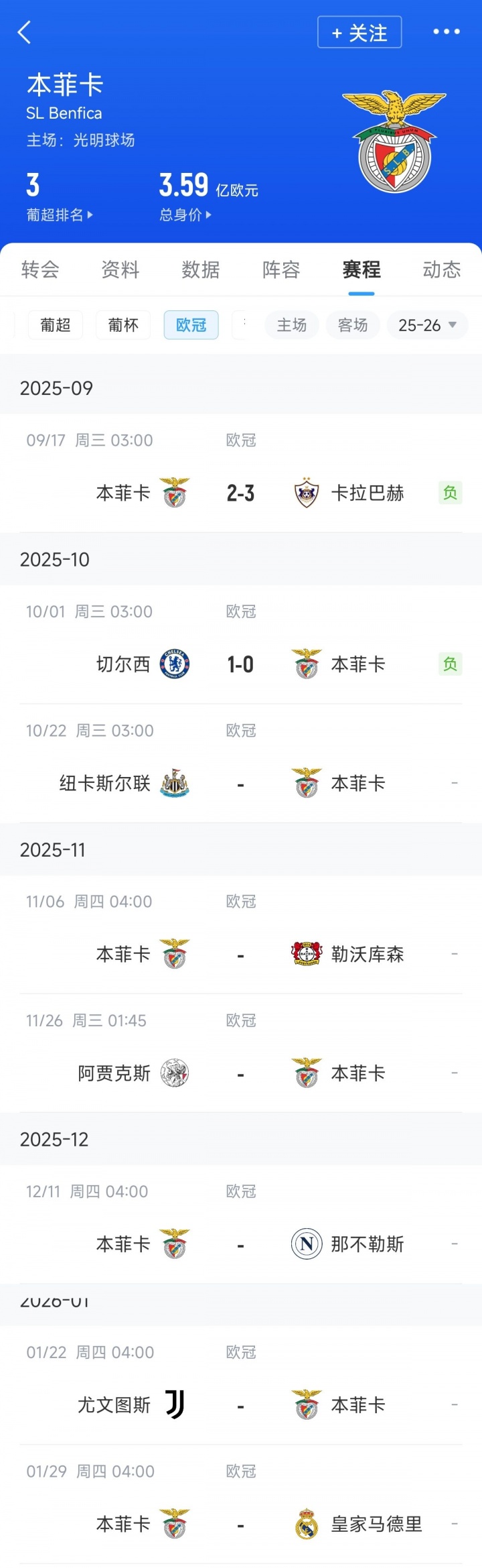 本菲卡本赛季的欧冠对手整体实力非常高,而他们首场比赛2-3爆冷不敌弱旅卡拉巴赫,前主帅拉热也因此下课。穆帅接手之后,本菲卡客场不敌切尔西,他接下来还将带队对阵:纽卡、勒沃库森、阿贾克斯、那不勒斯、尤文图斯、皇马,均是各国豪门劲旅。