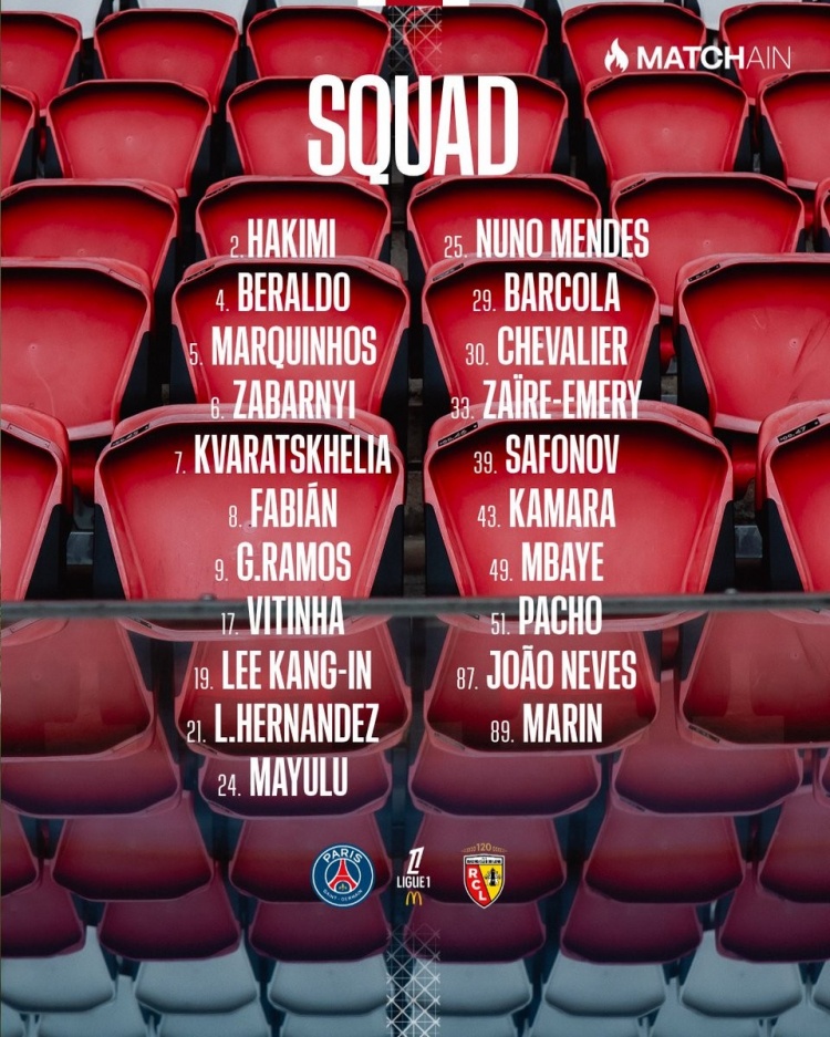 巴黎联赛大名单:K77、李刚仁、维蒂尼亚入选 登贝莱、杜埃伤缺...