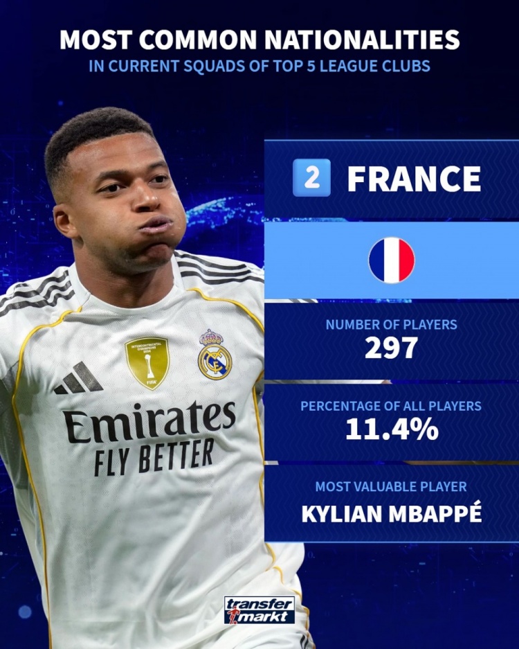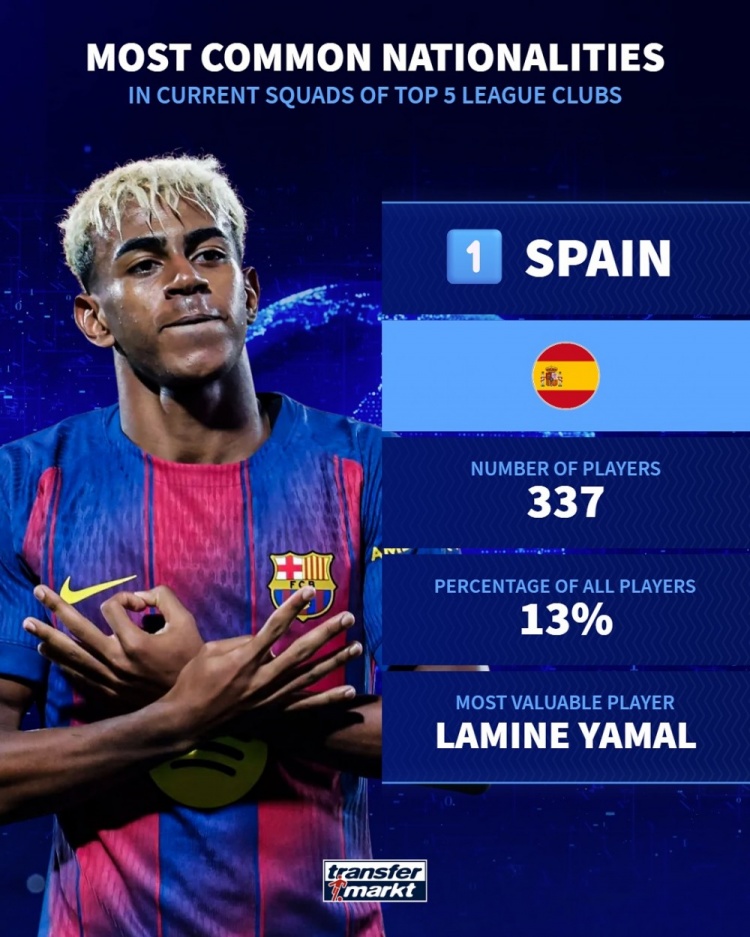 五大联赛各国球员数量榜:西班牙337人居首,法国297人次席