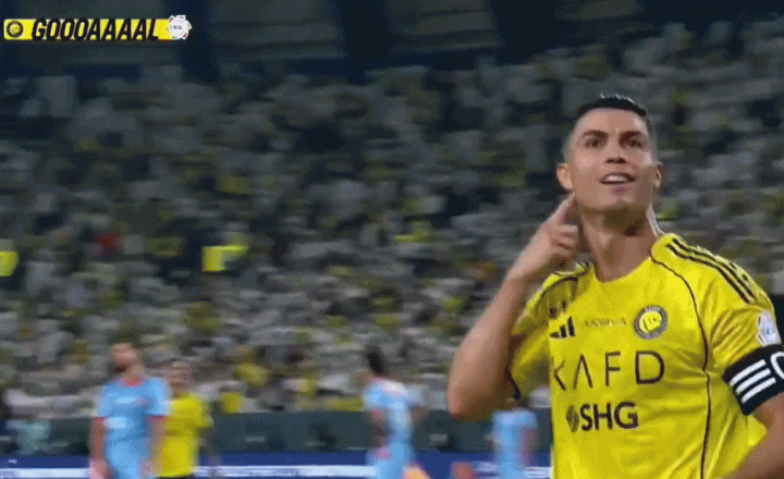 比赛中,利雅得体育球迷高喊梅西的名字,C罗在进球后笑着手指耳朵摇头,并摊了一下手。