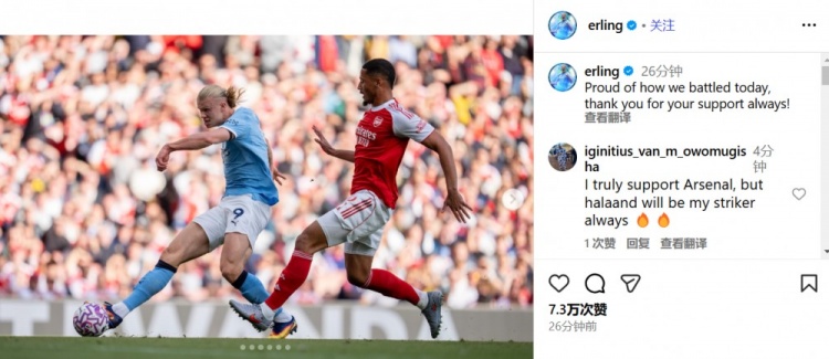 在社交媒体上,哈兰德写道:为今天的拼搏感到自豪,感谢你们一如既往的支持。