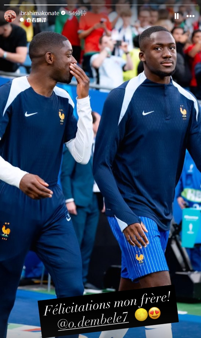 科纳特晒出了自己与登贝莱在国家队的合照,配文写道:“祝贺你,我的兄弟!🌕😍”