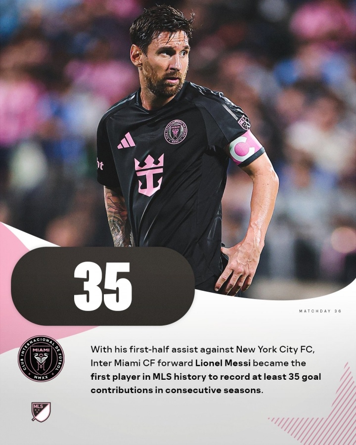 据美职联官方统计,梅西成为美职联历史首位,连续两个赛季直接参与35球的球员。