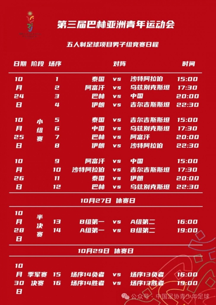 10月4日讯 10月22日-10月31日,第三届亚洲青年运动会(以下简称“巴林亚青会”)将在巴林举行,本届比赛首次将五人制足球纳入正式比赛项目,中国队分别派出男、女队参赛。近日,巴林亚青会组委会公布五人制足球项目竞赛日程。