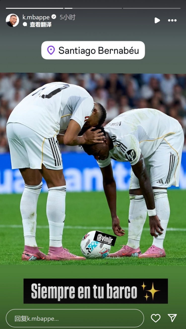 暖心让点!姆巴佩社媒晒与维尼修斯合照:永远与你同在...