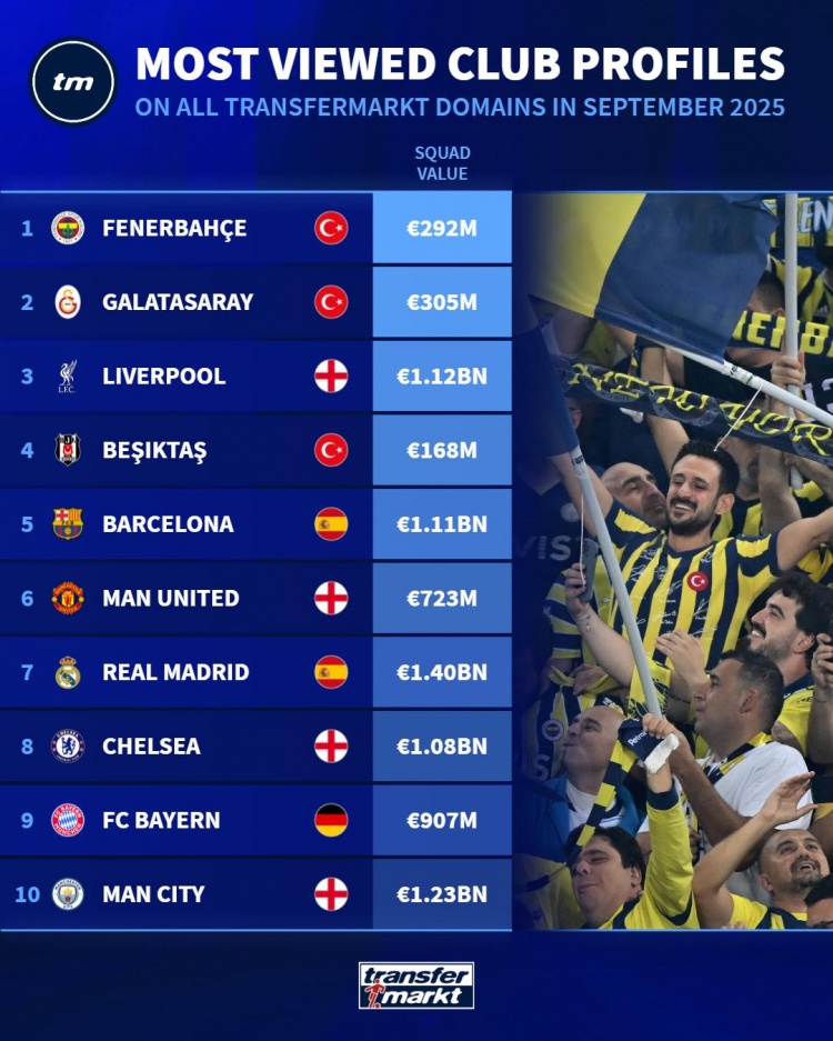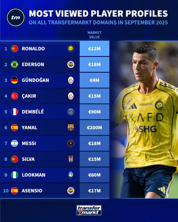 德转球员页面9月浏览量排名:C罗居首,埃德森第二、梅西第七...